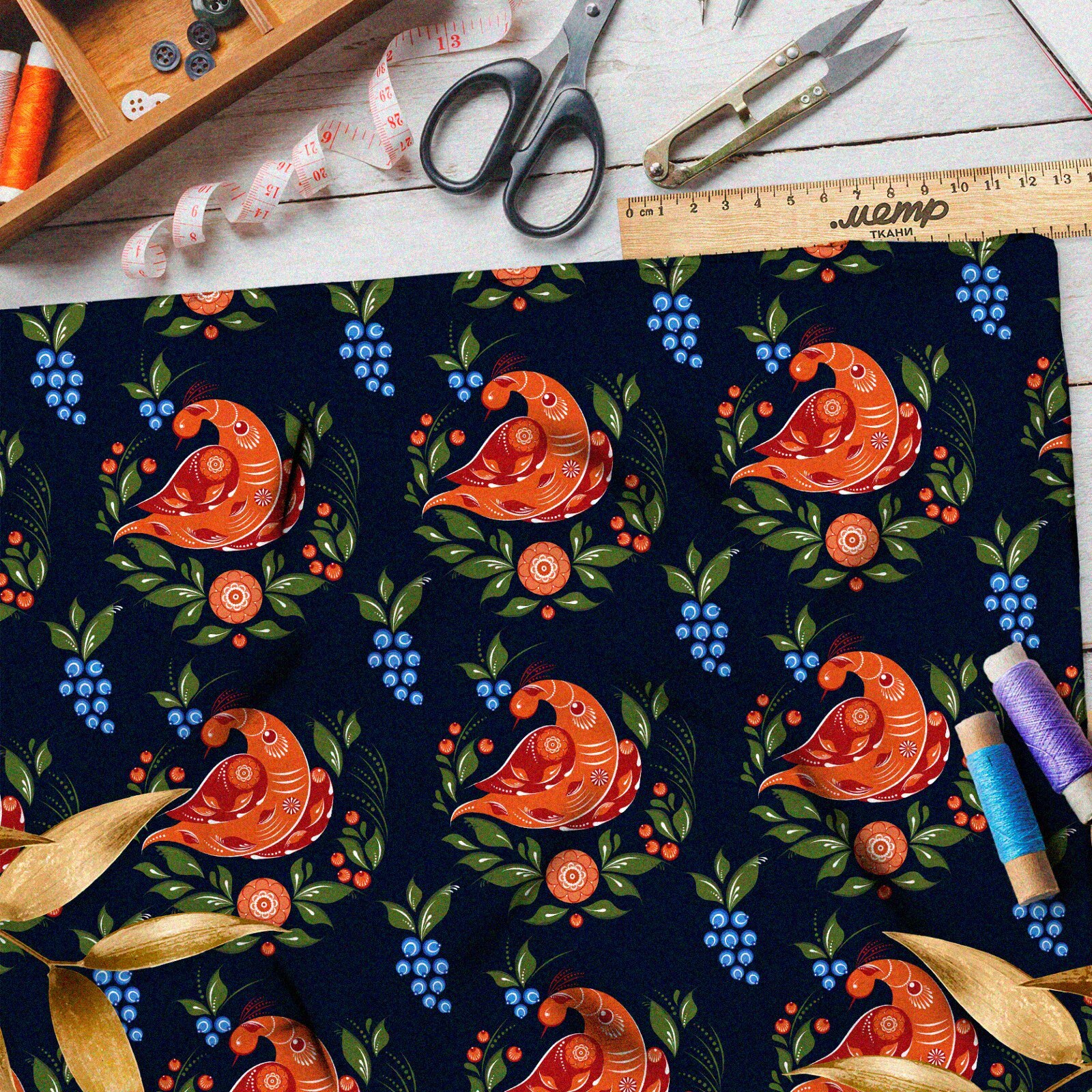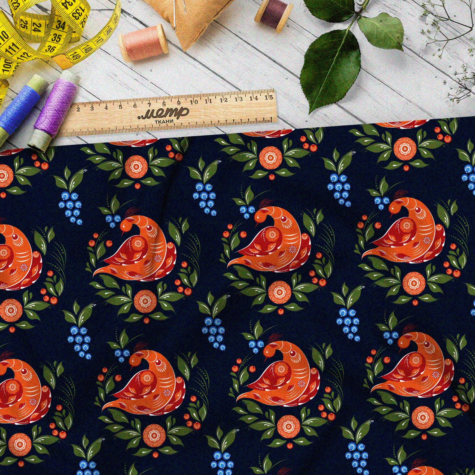 Ткань атлас красная голубка и ягоды на чёрном фоне
