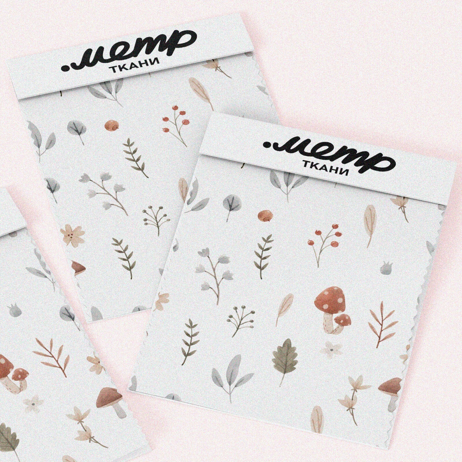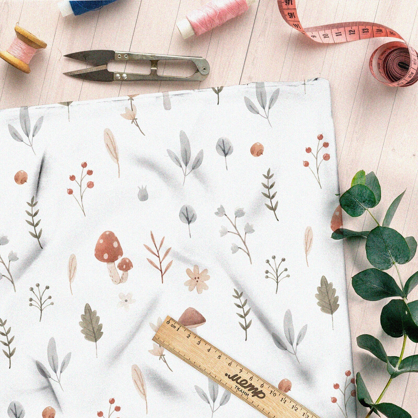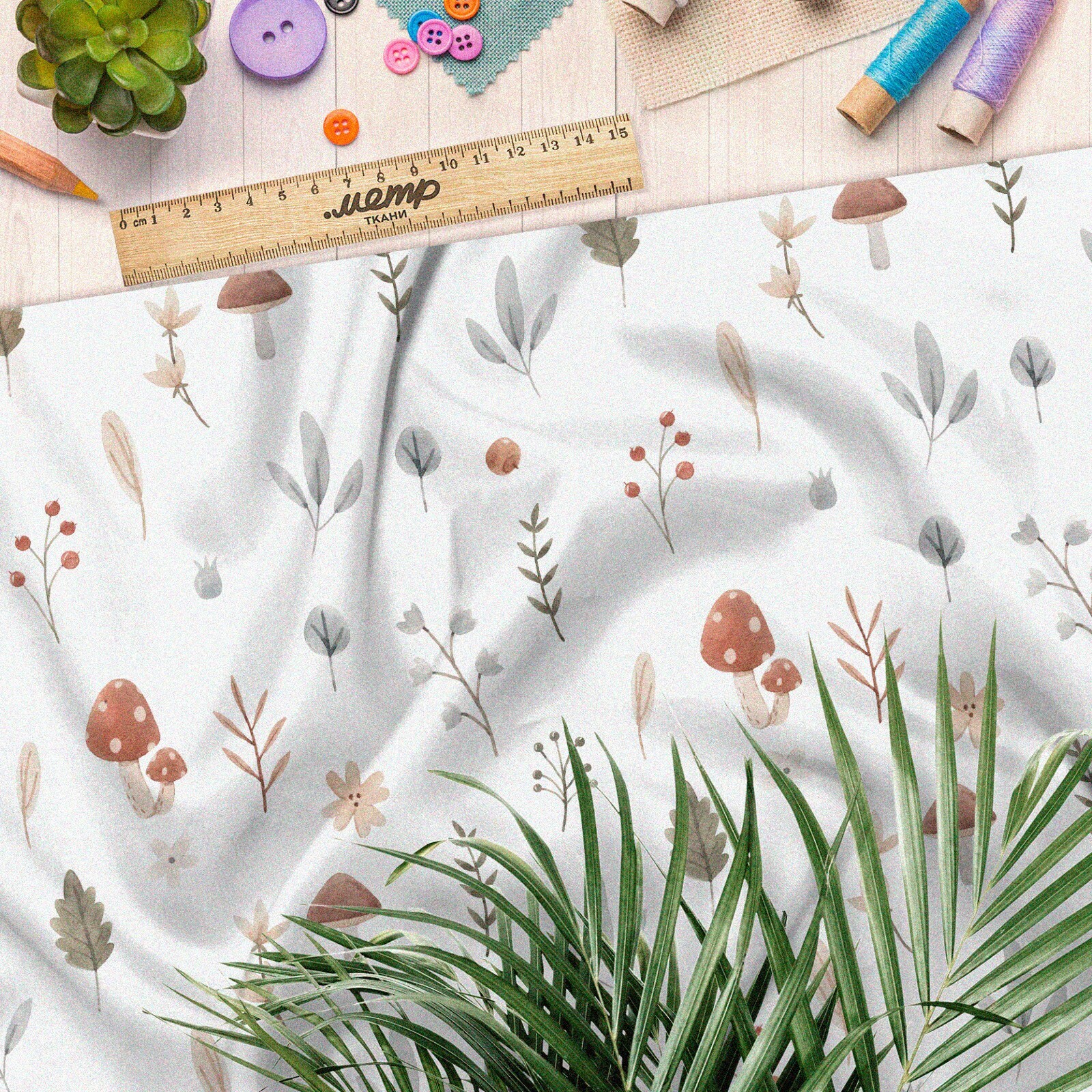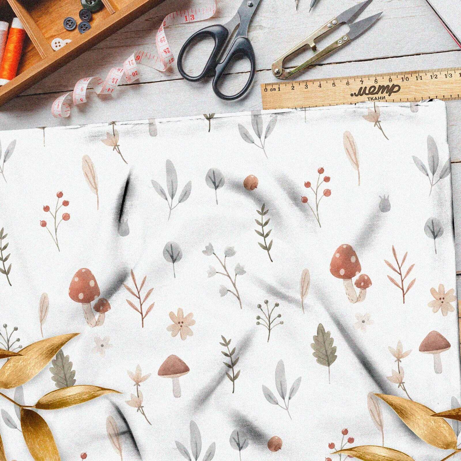 Ткань атлас осенние грибы с листочками