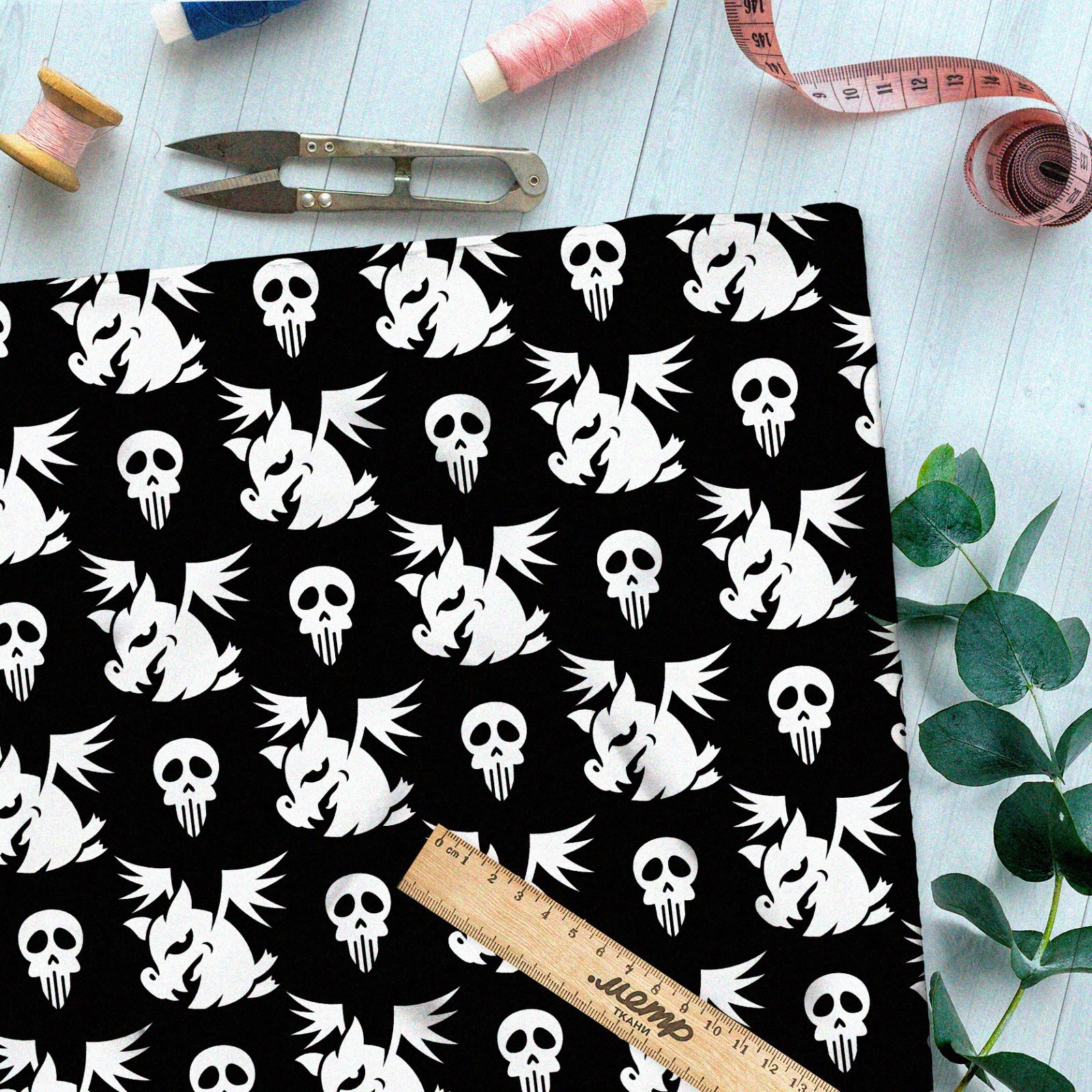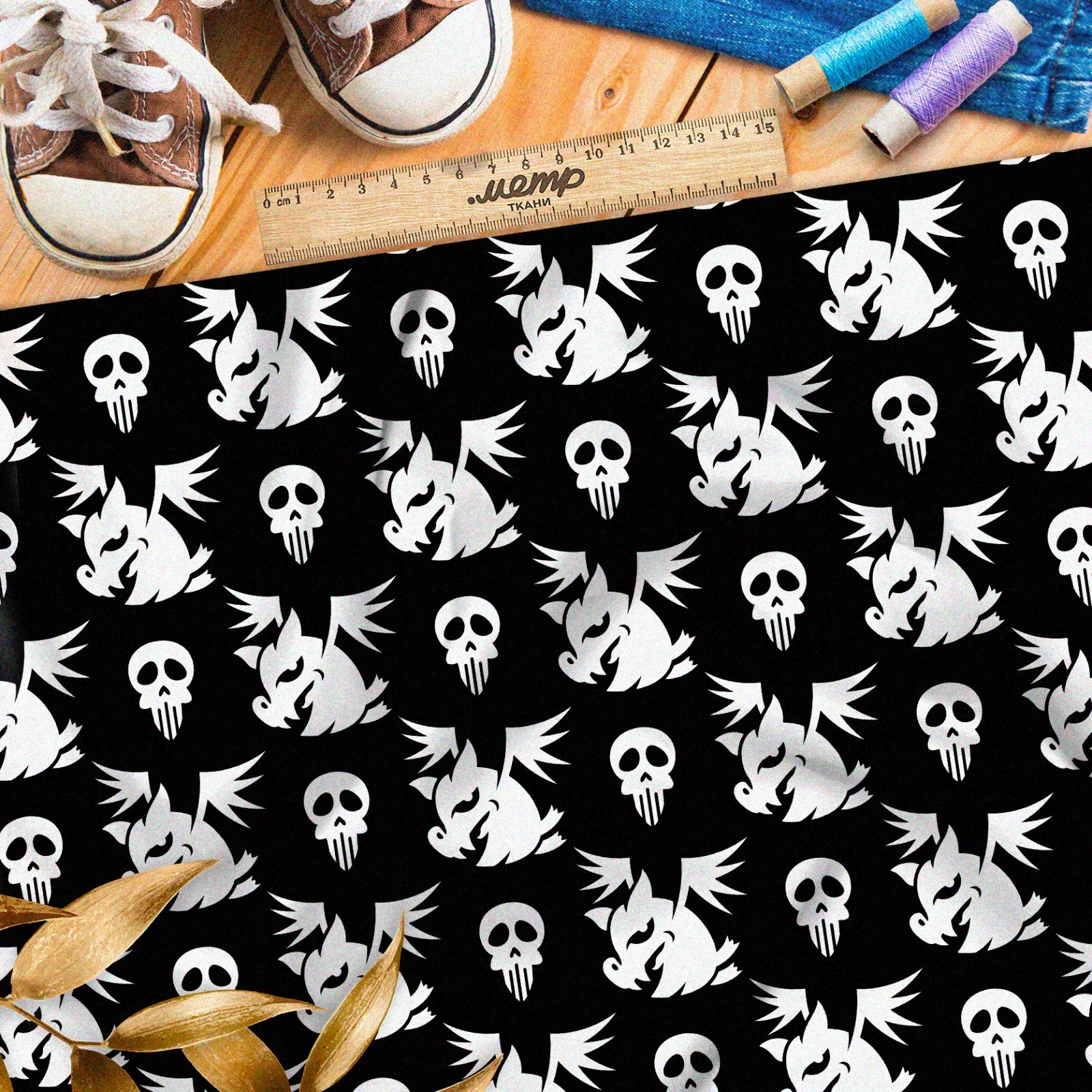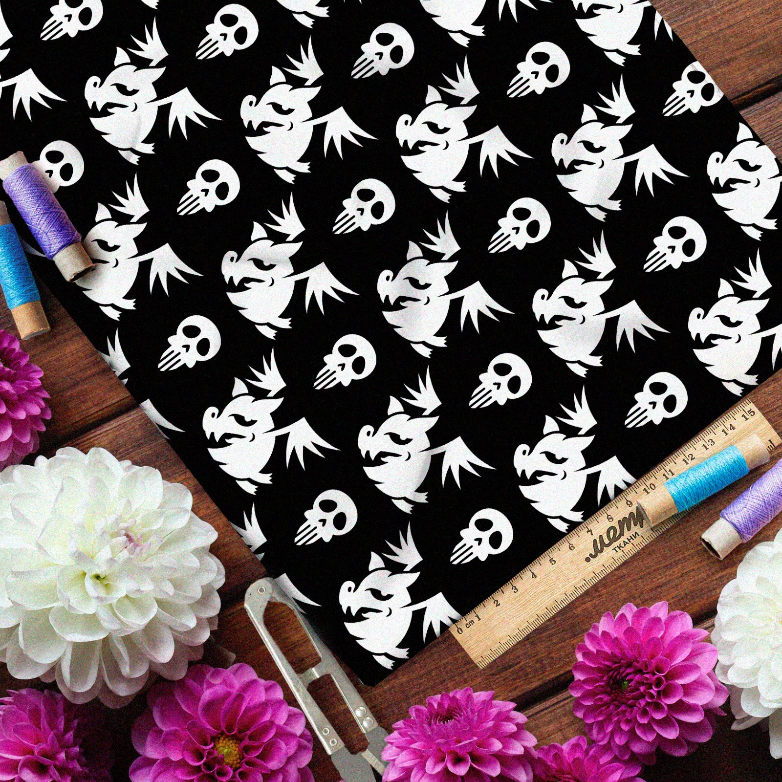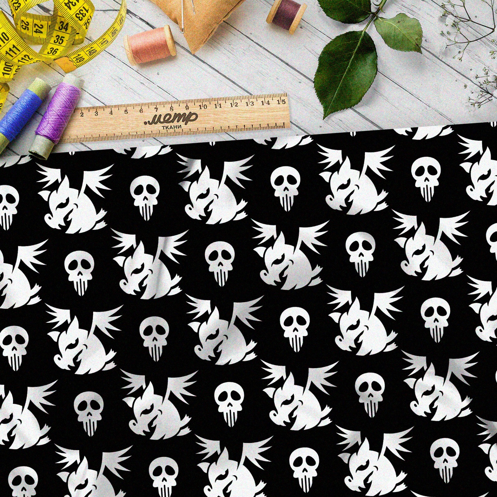 Ткань бифлекс недовольные драконы и черепа на чёрном фоне