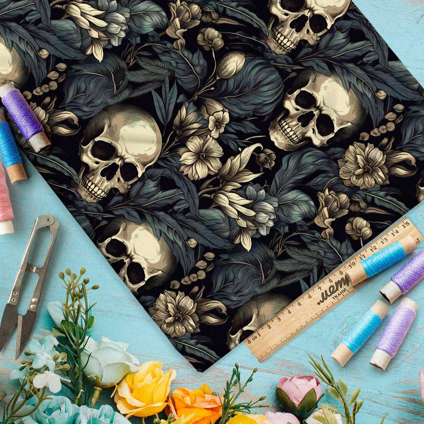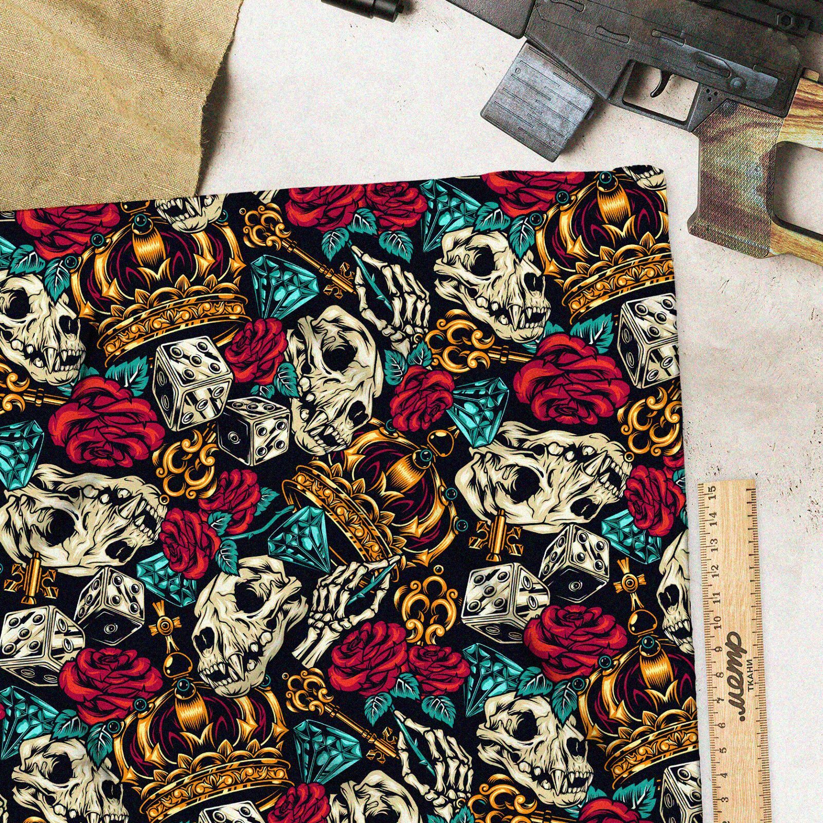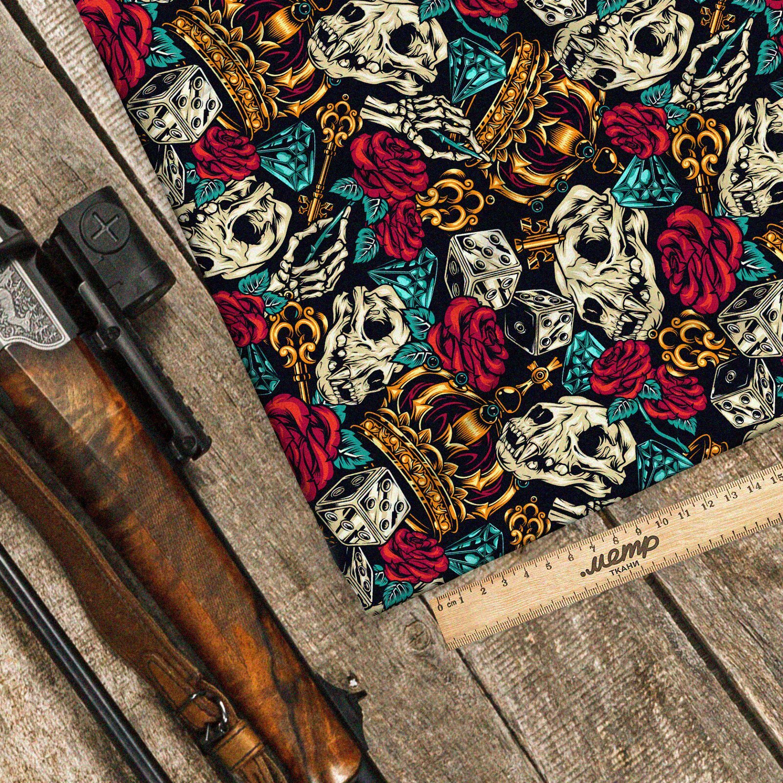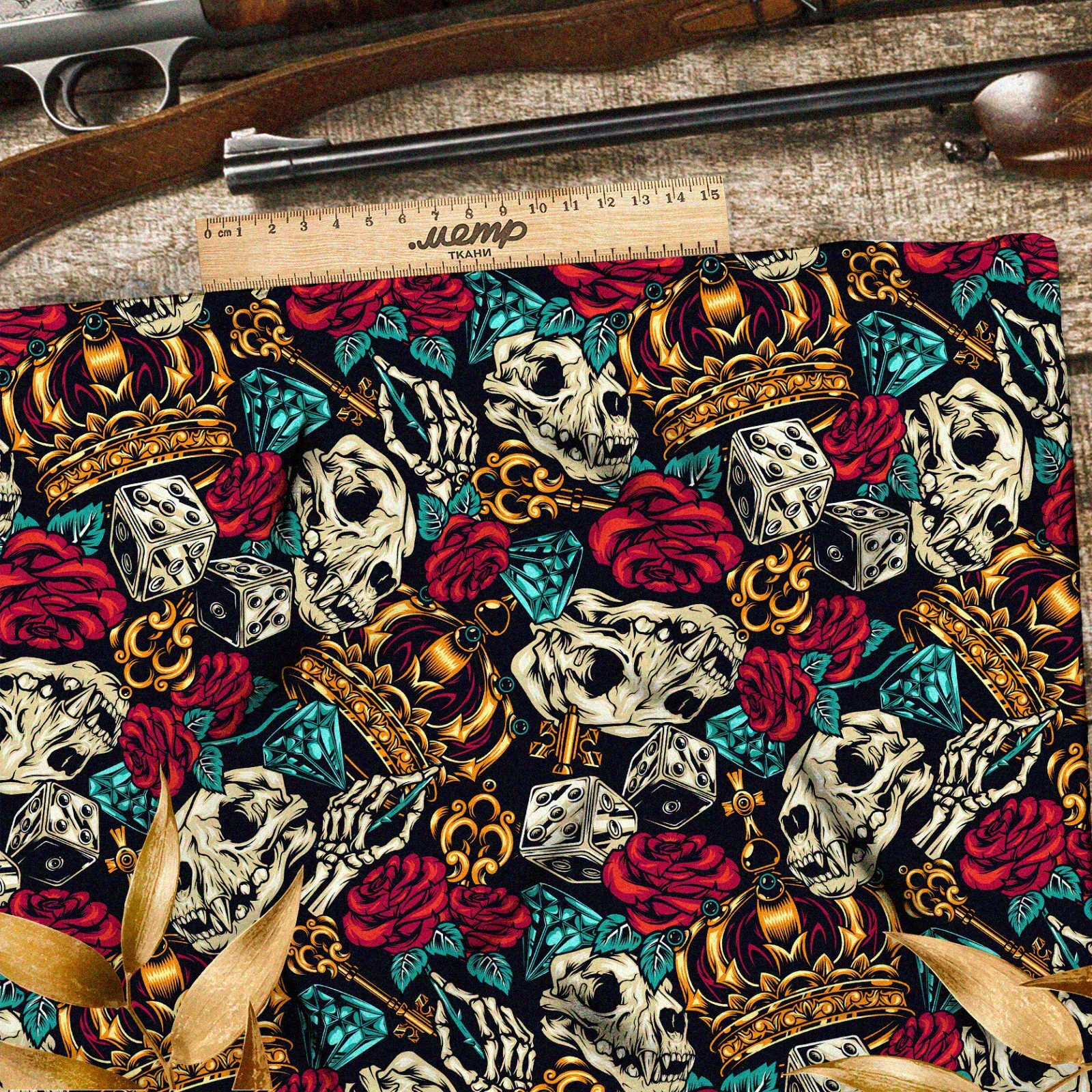 Ткань бифлекс кости, розы, бриллианты и короны на чёрном фоне