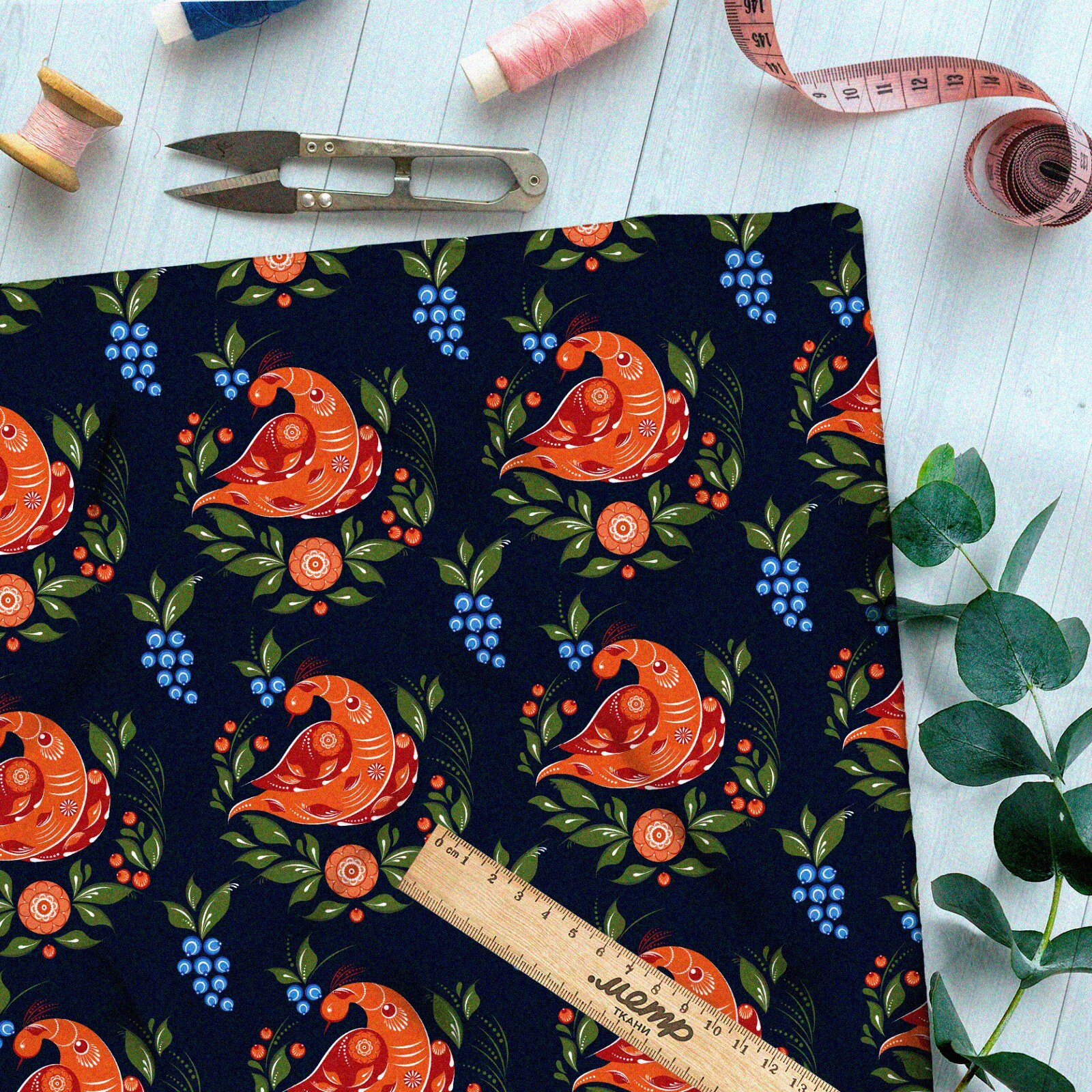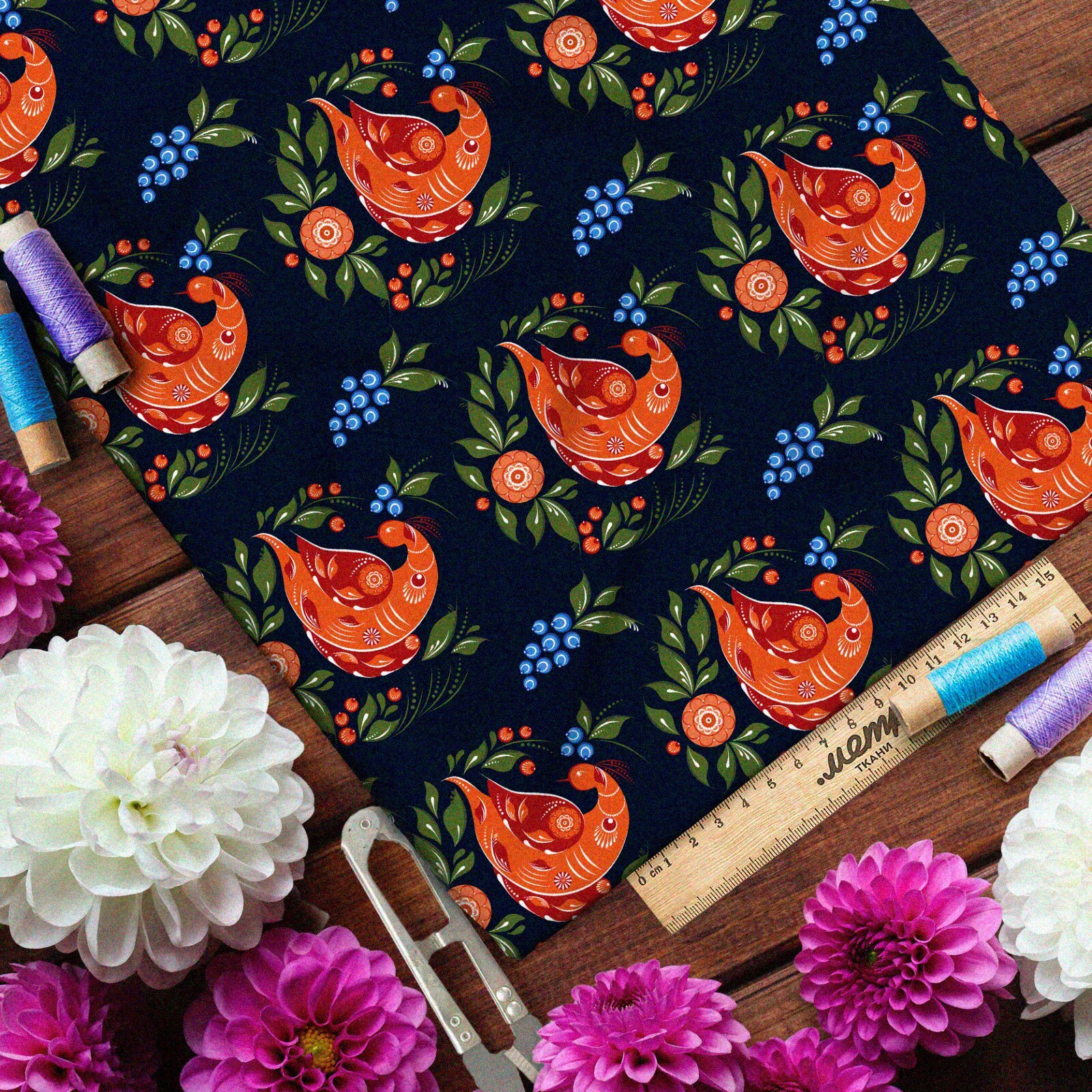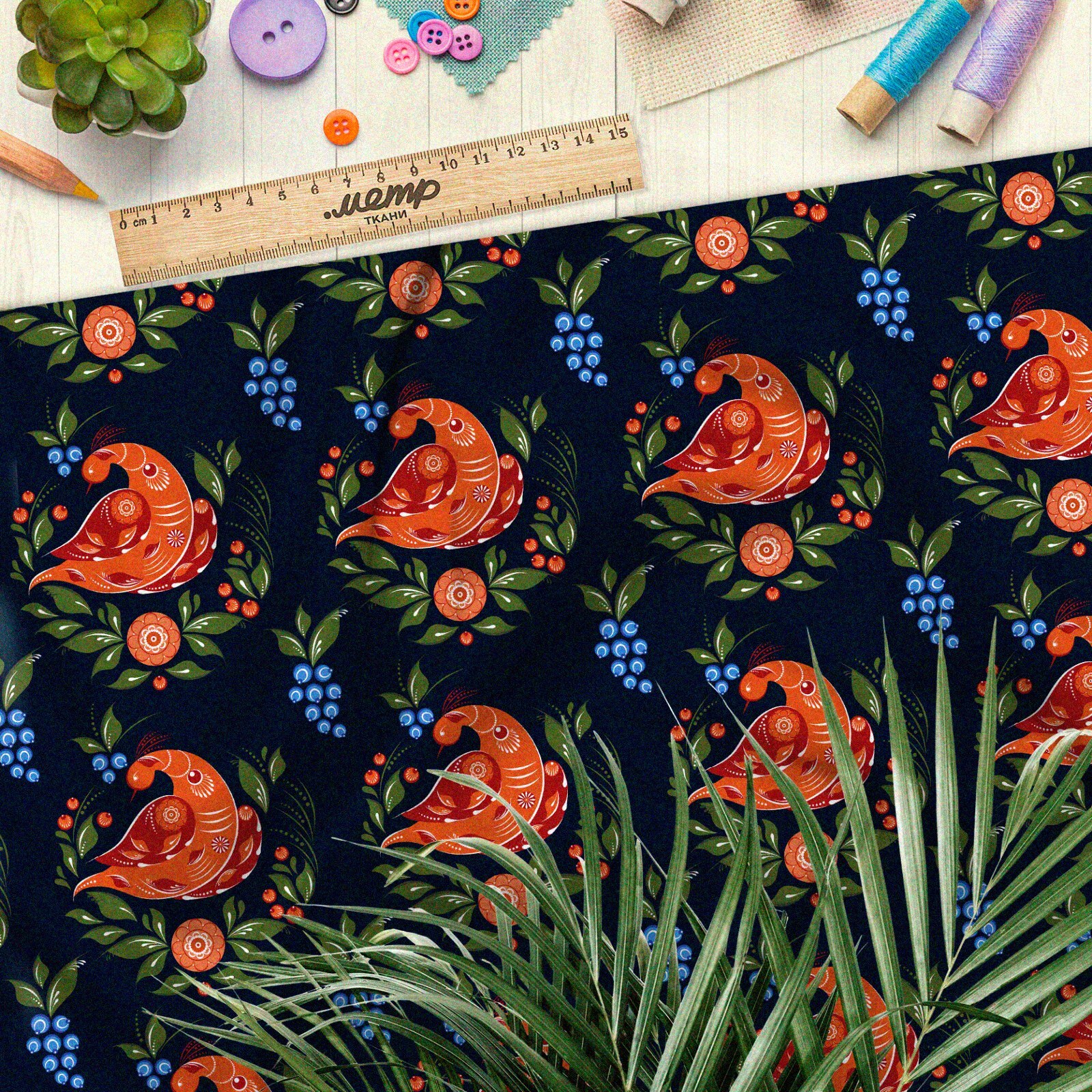 Ткань дюспо красная голубка и ягоды на чёрном фоне