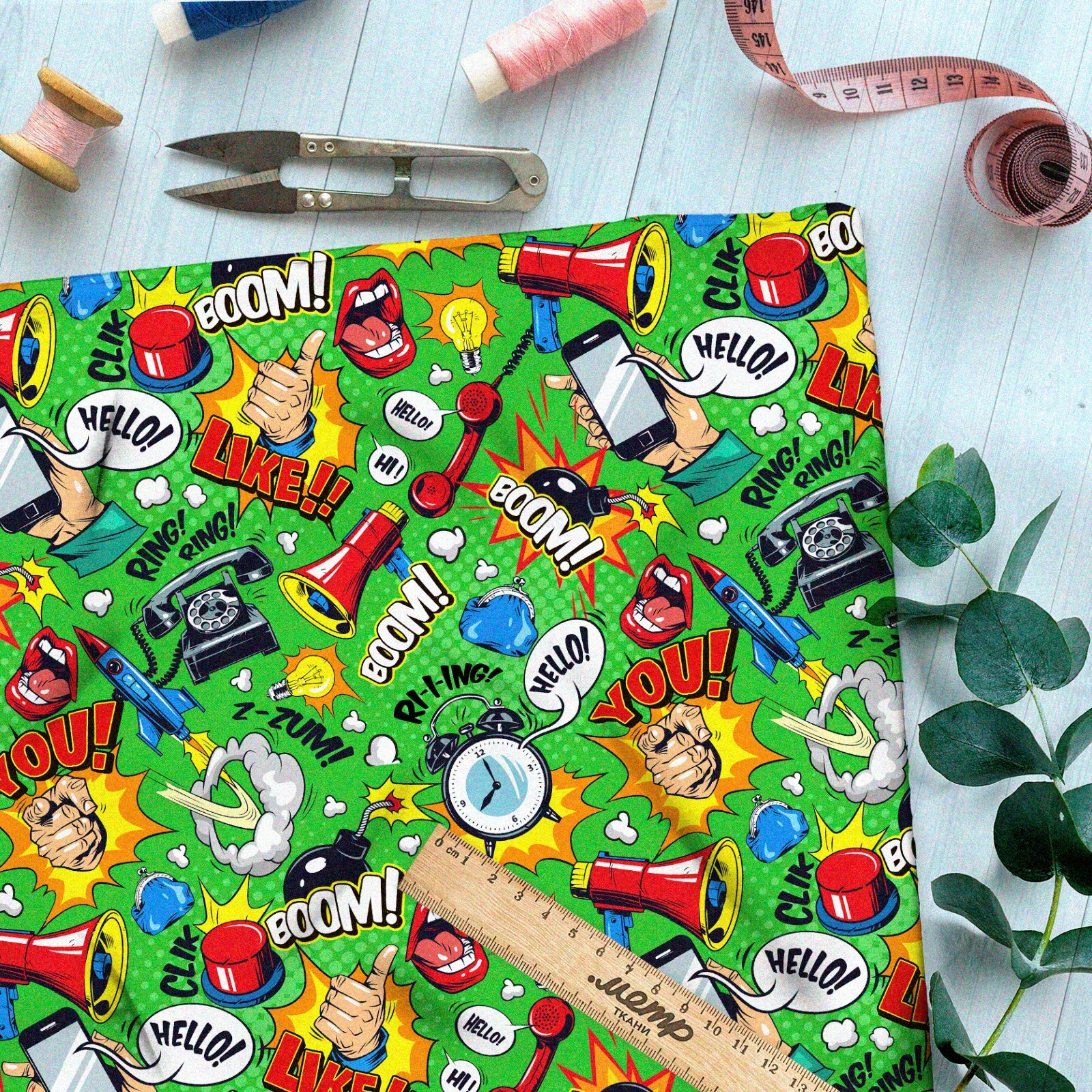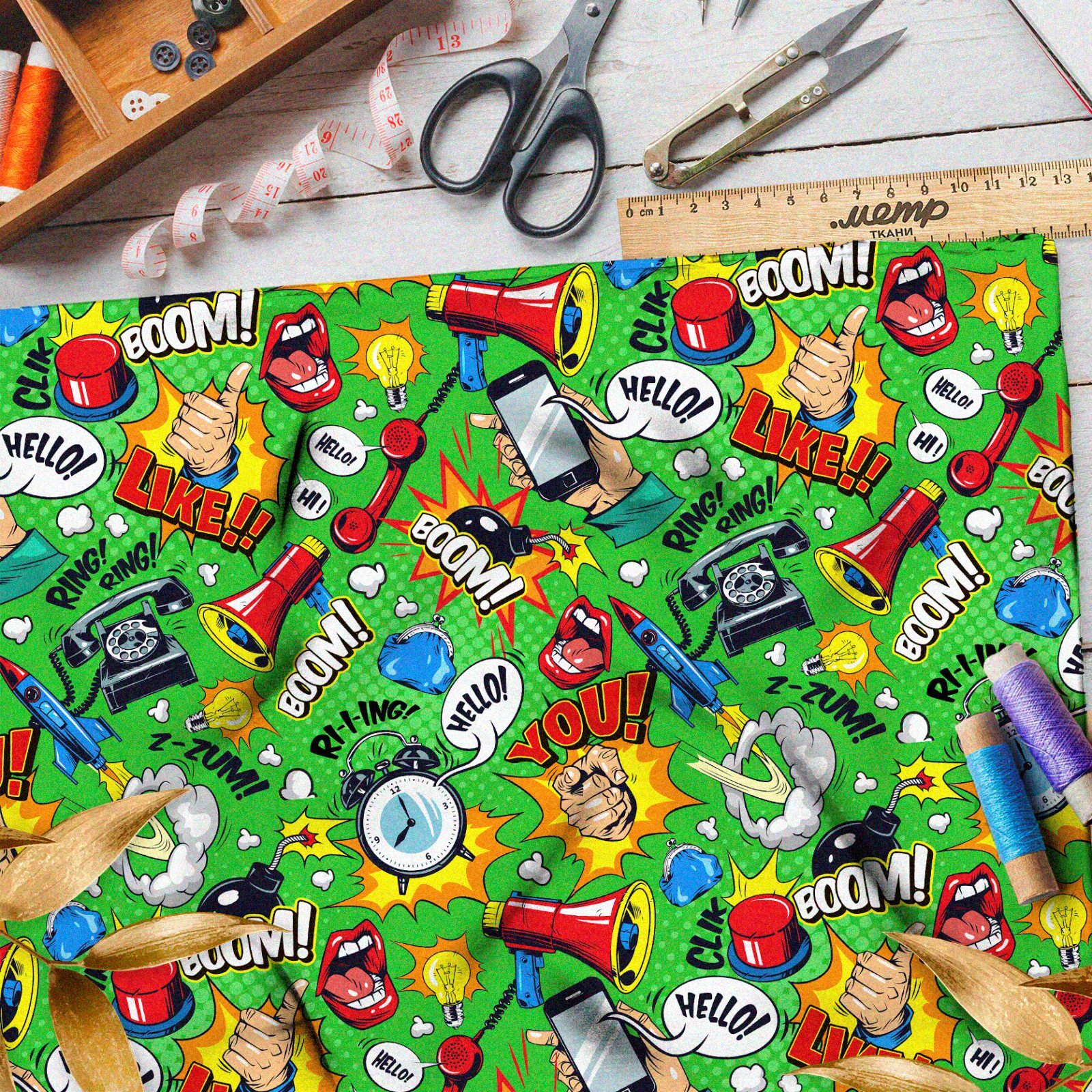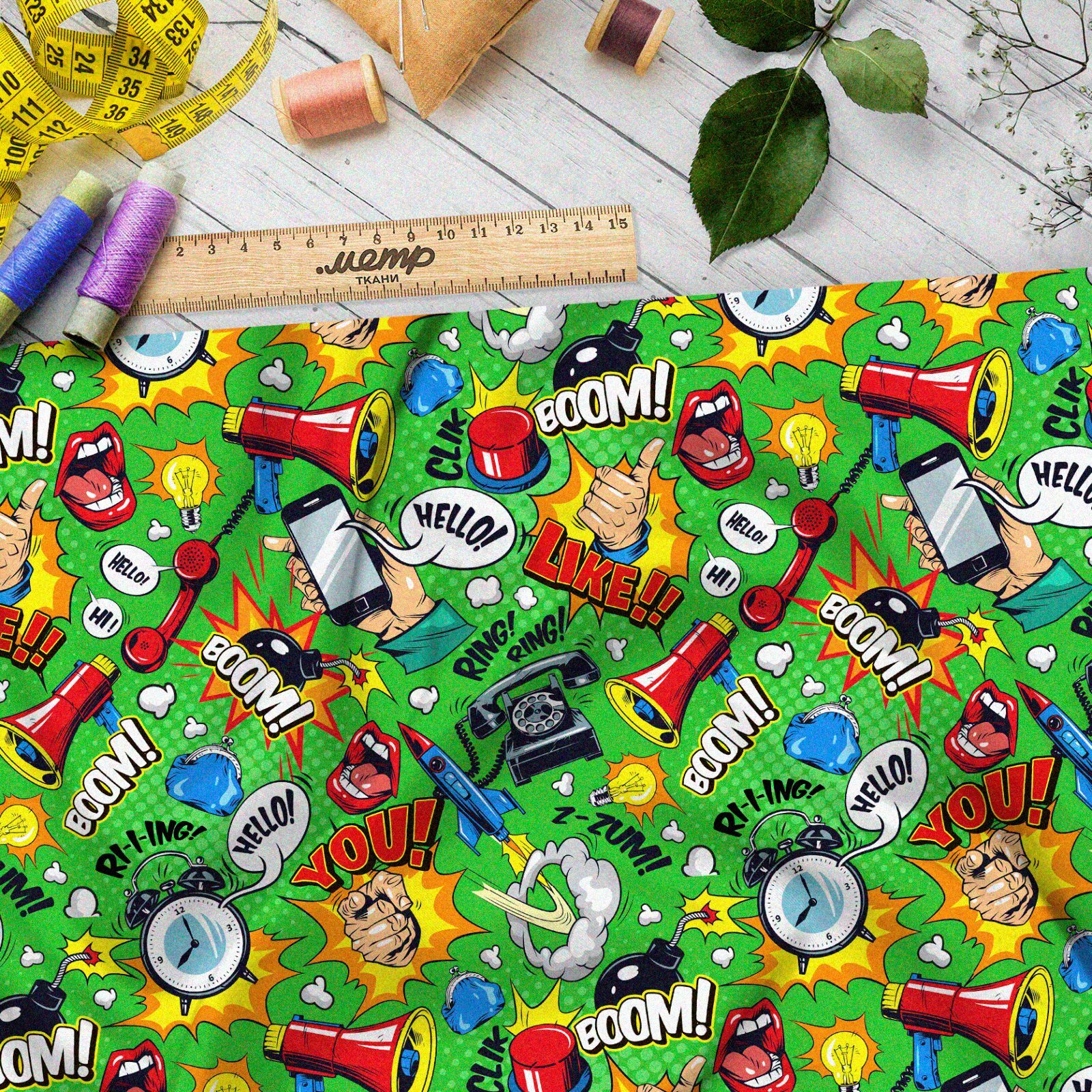 Ткань габардин громкие предметы из комиксов на зелёном фоне