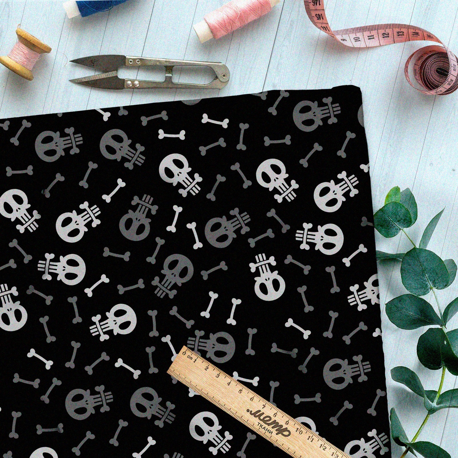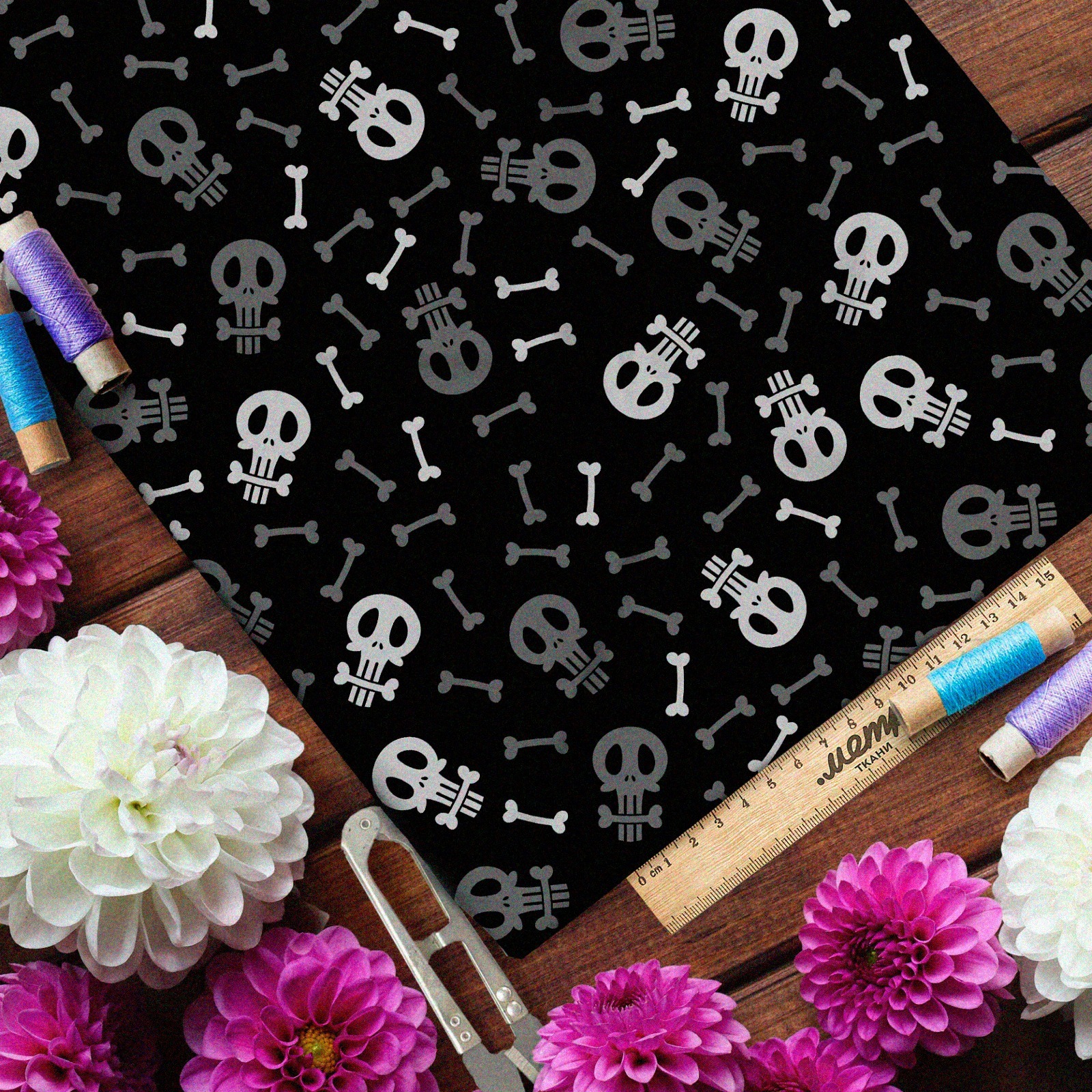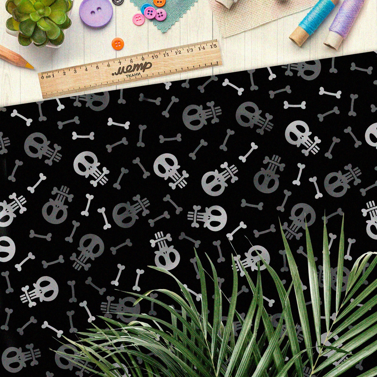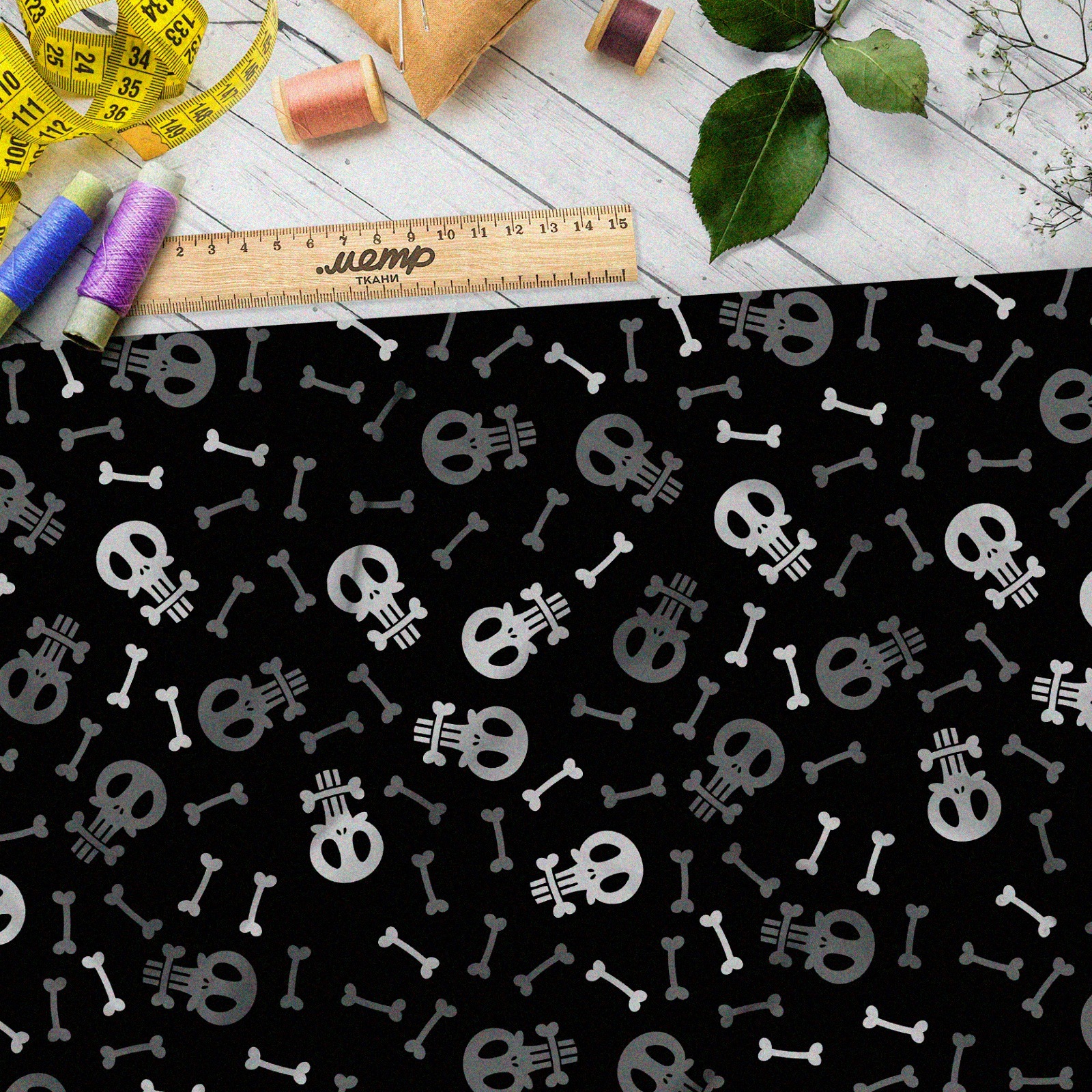 Ткань габардин белые черепа и серые кости на чёрном фоне