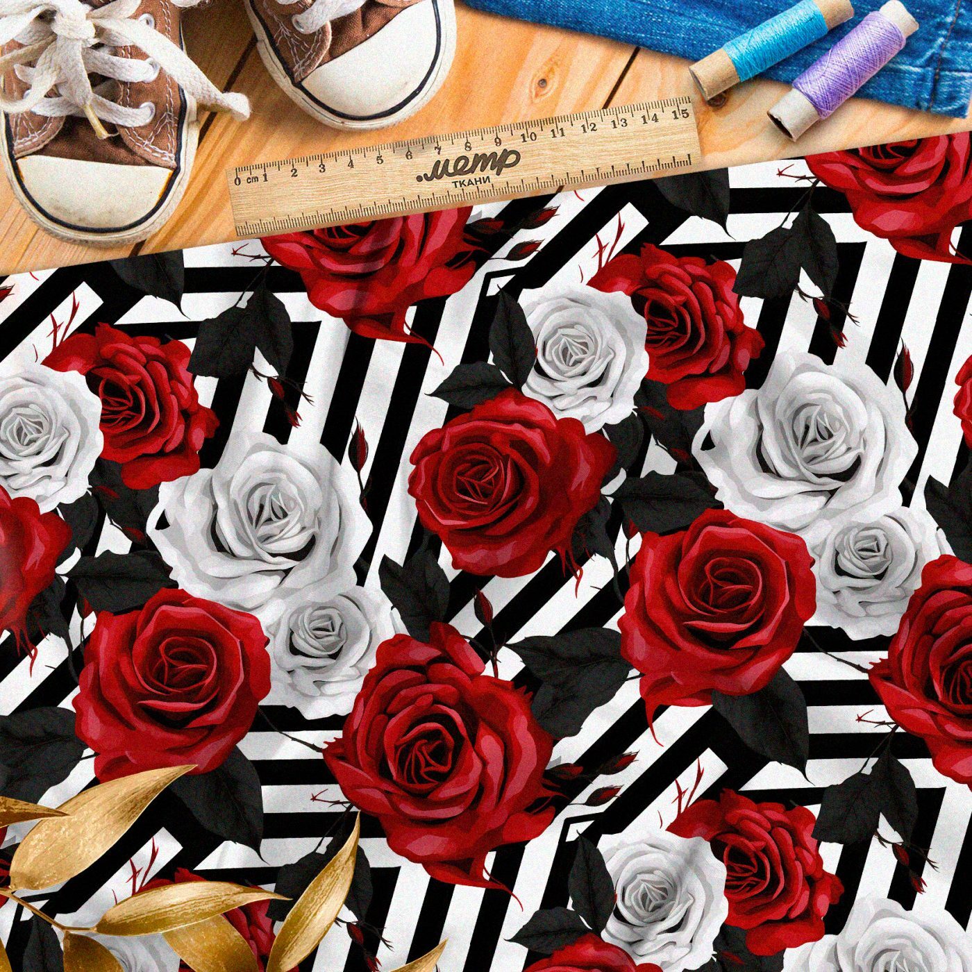 Ткань премиум интерлок розы на полосатом фоне