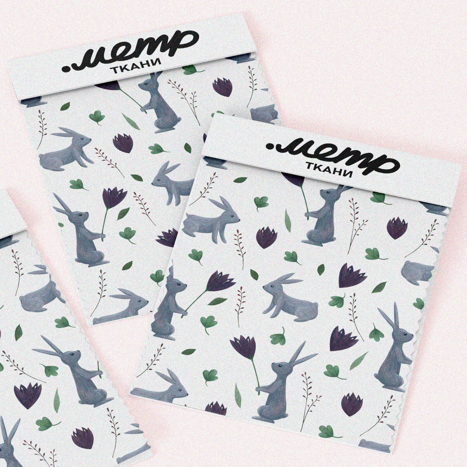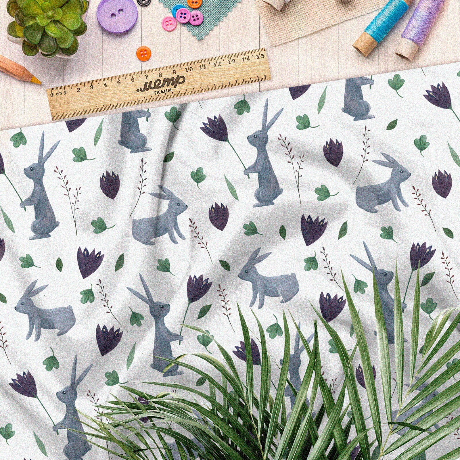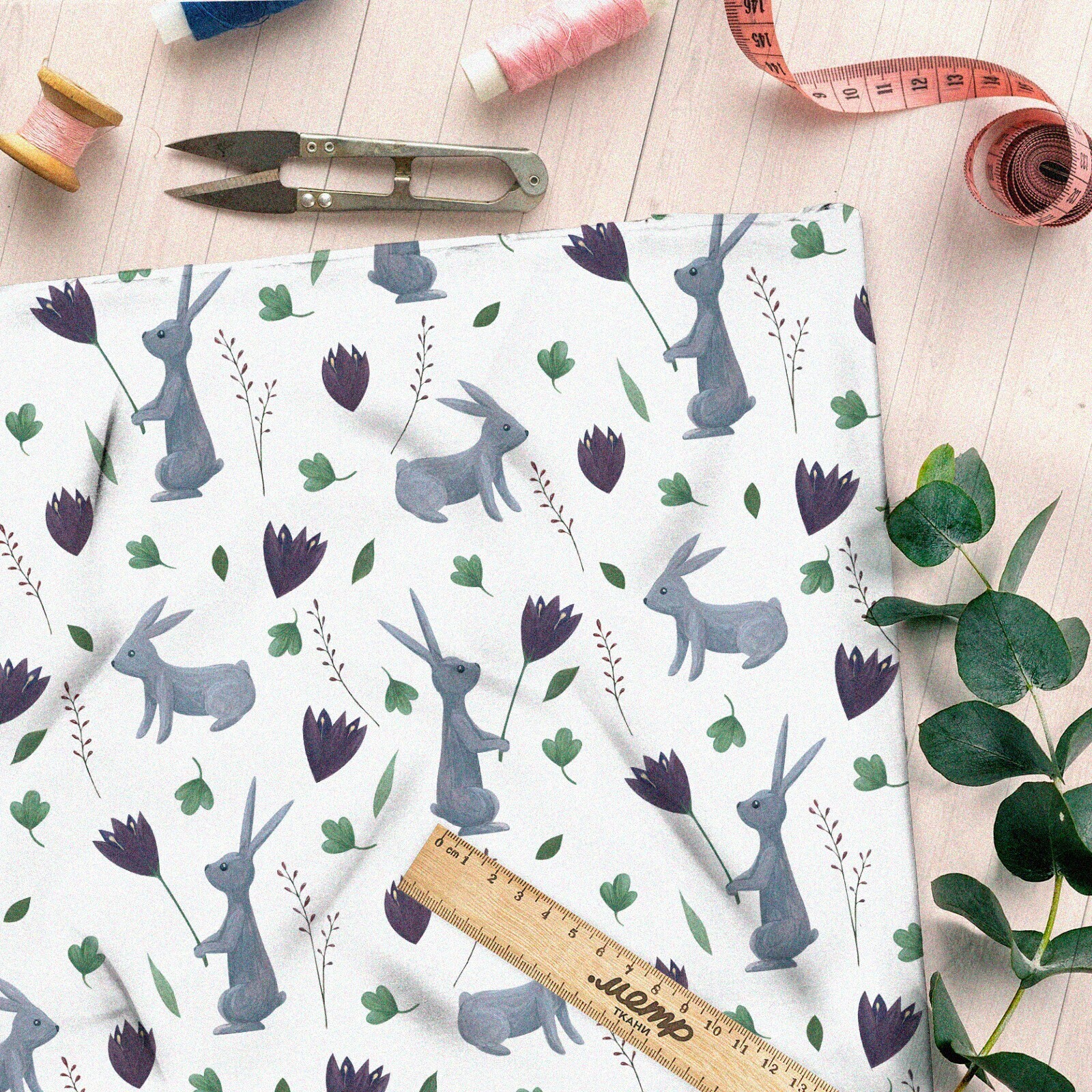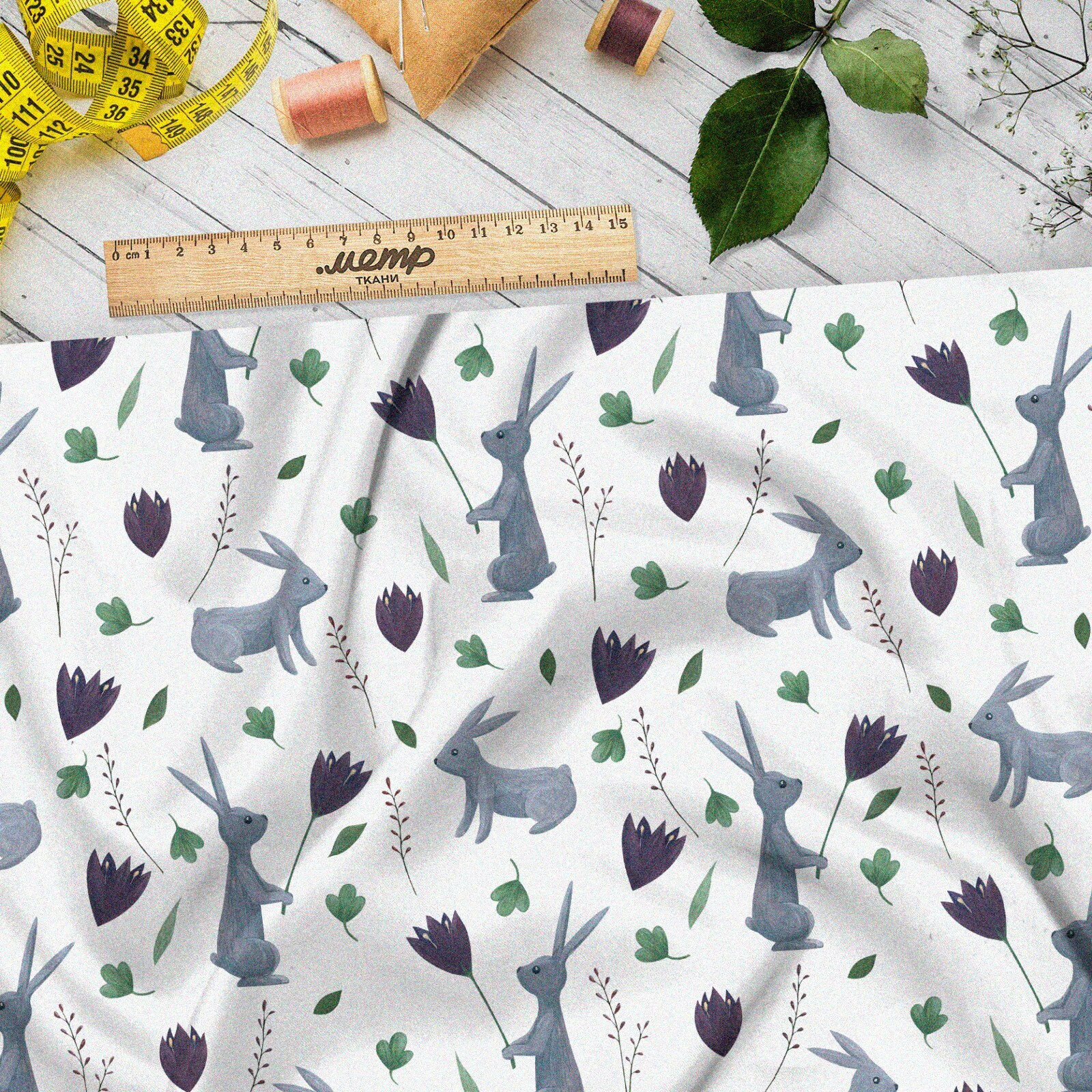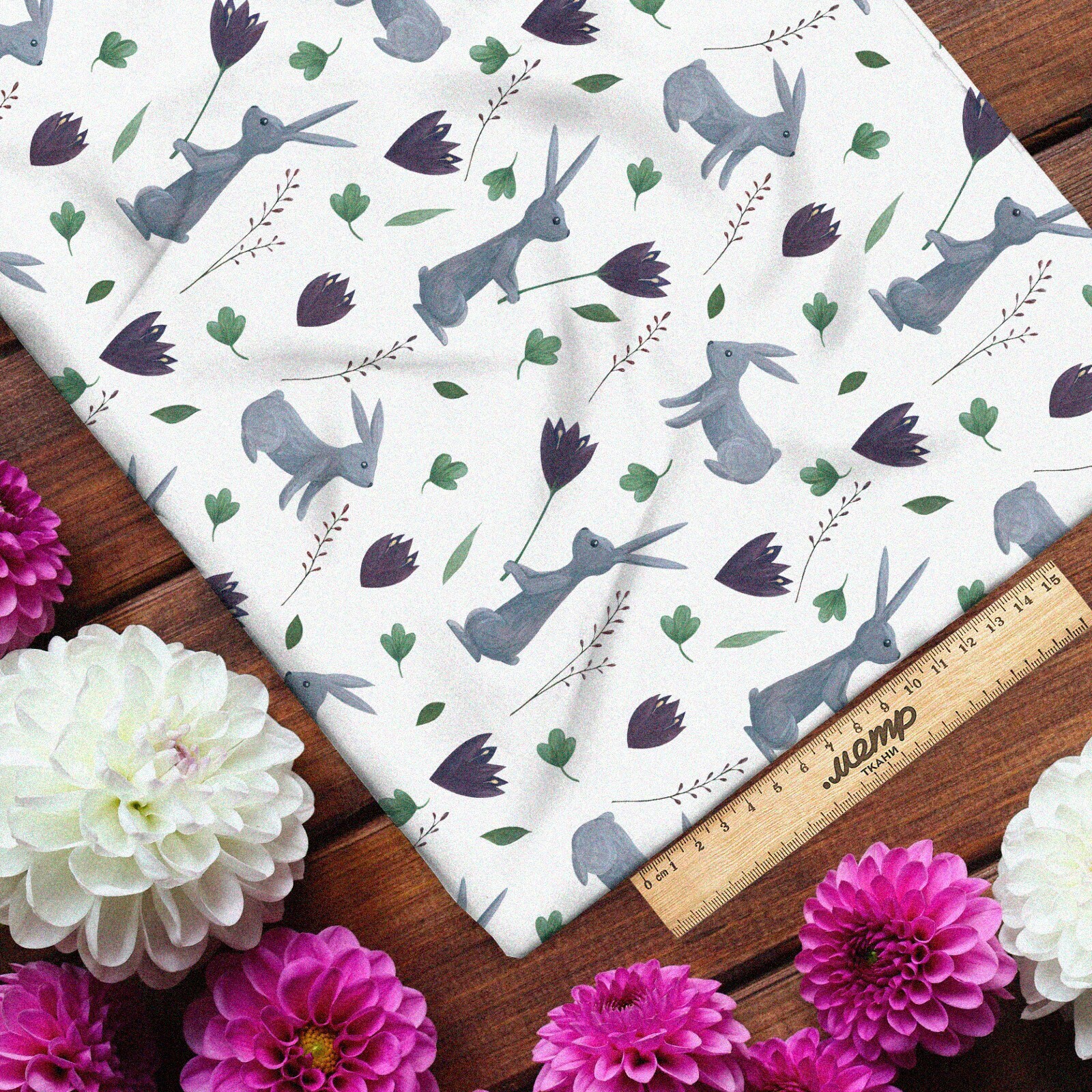 Ткань ниагара серые зайцы с цветами