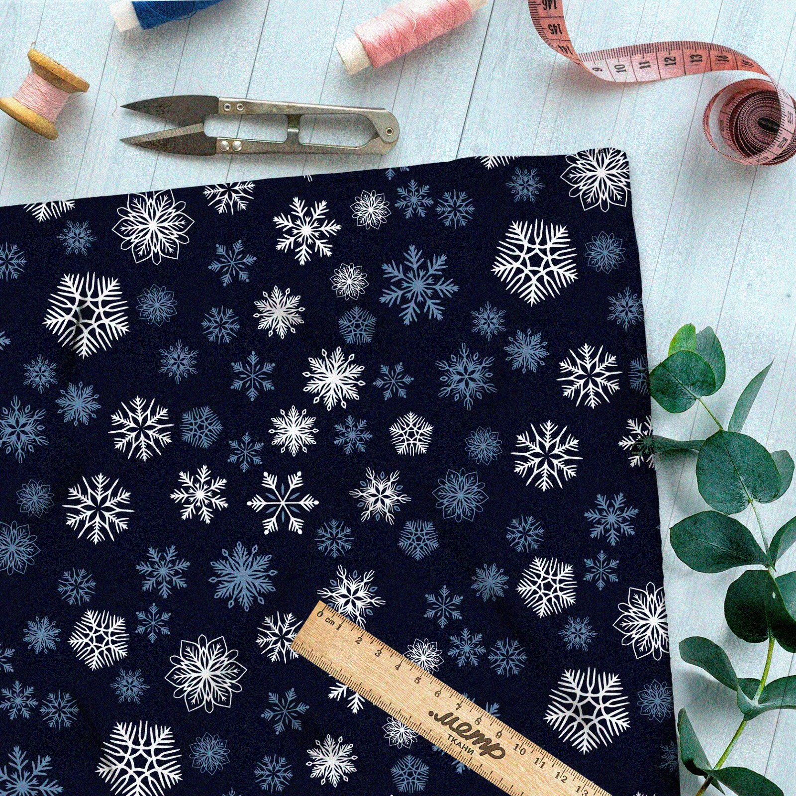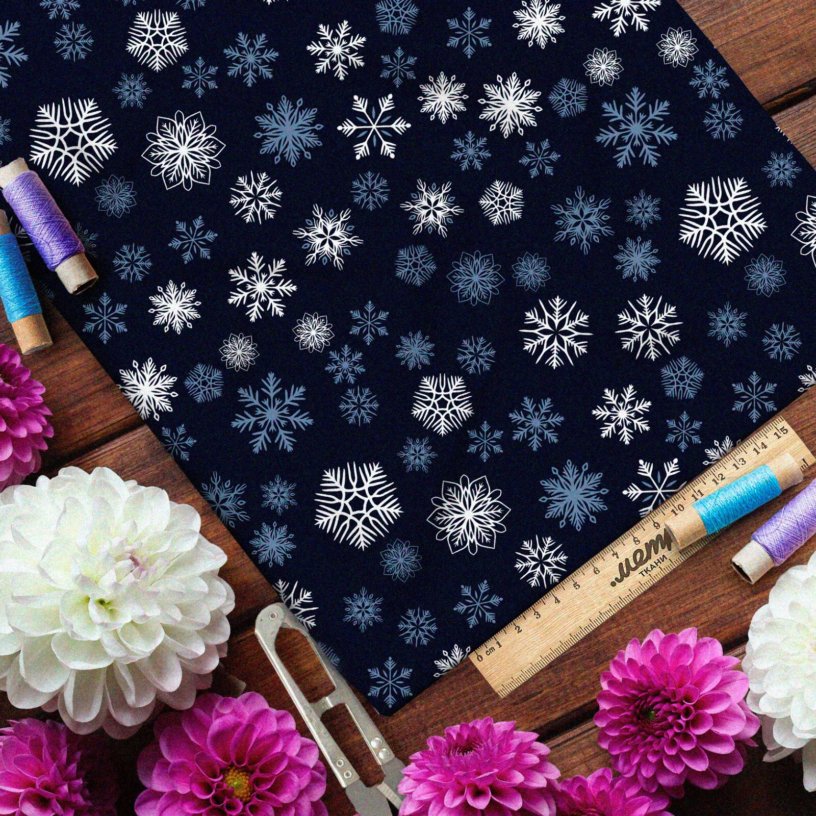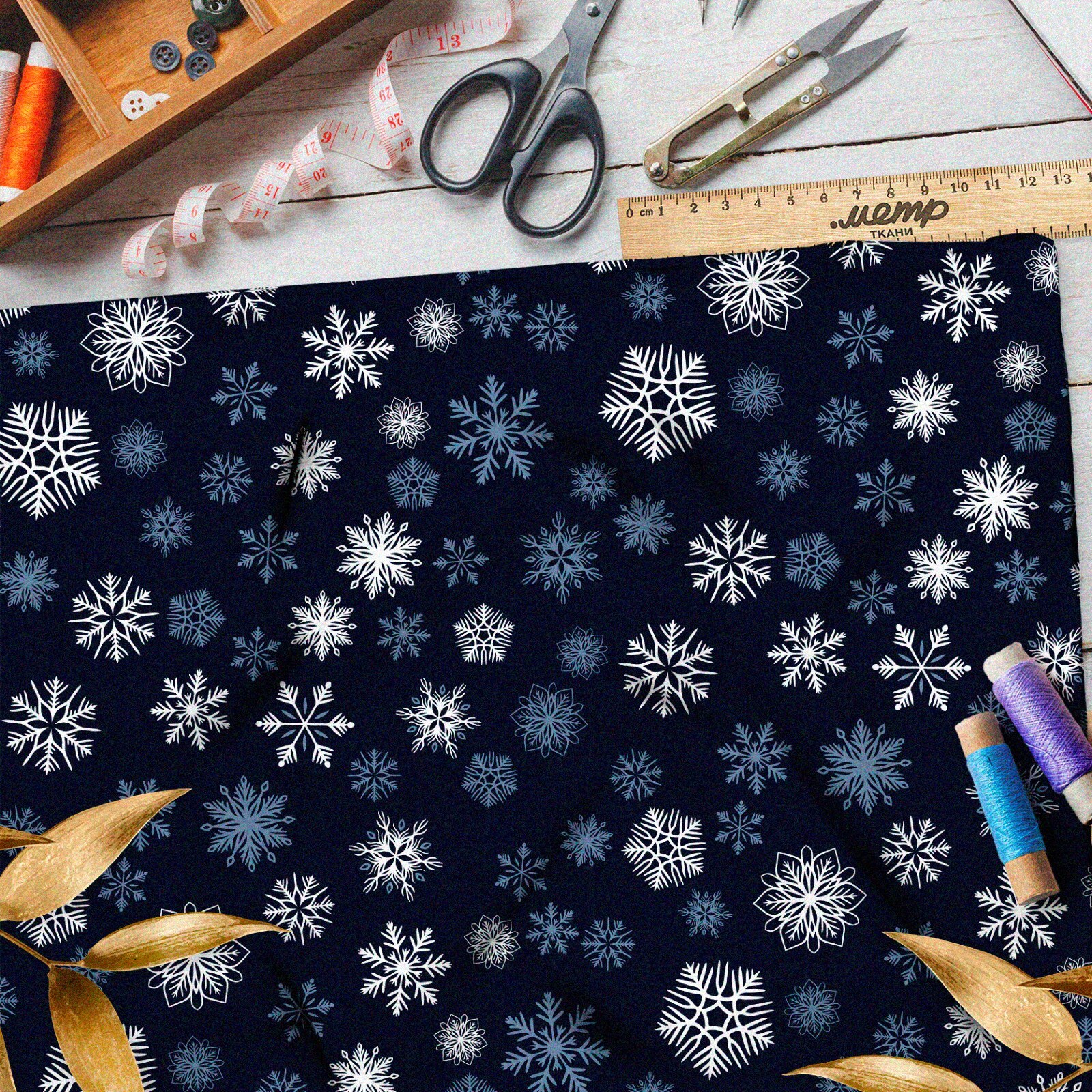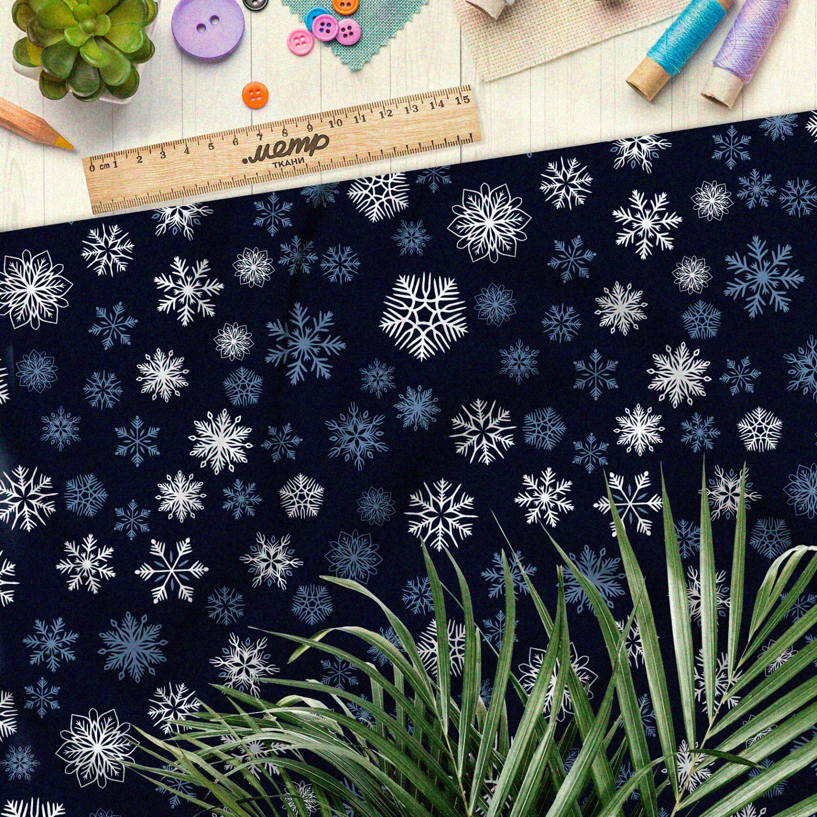 Ткань шелк Армани белые и голубые снежинки на тёмно-синем фоне