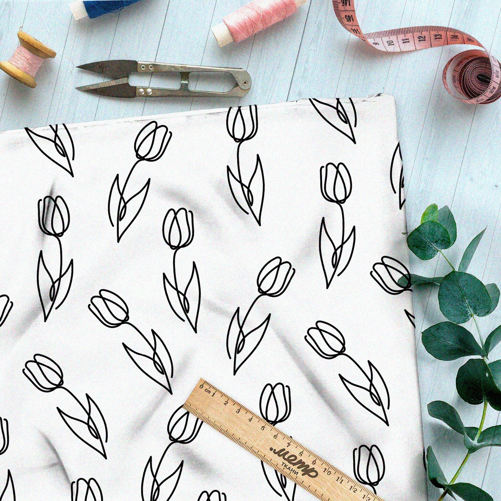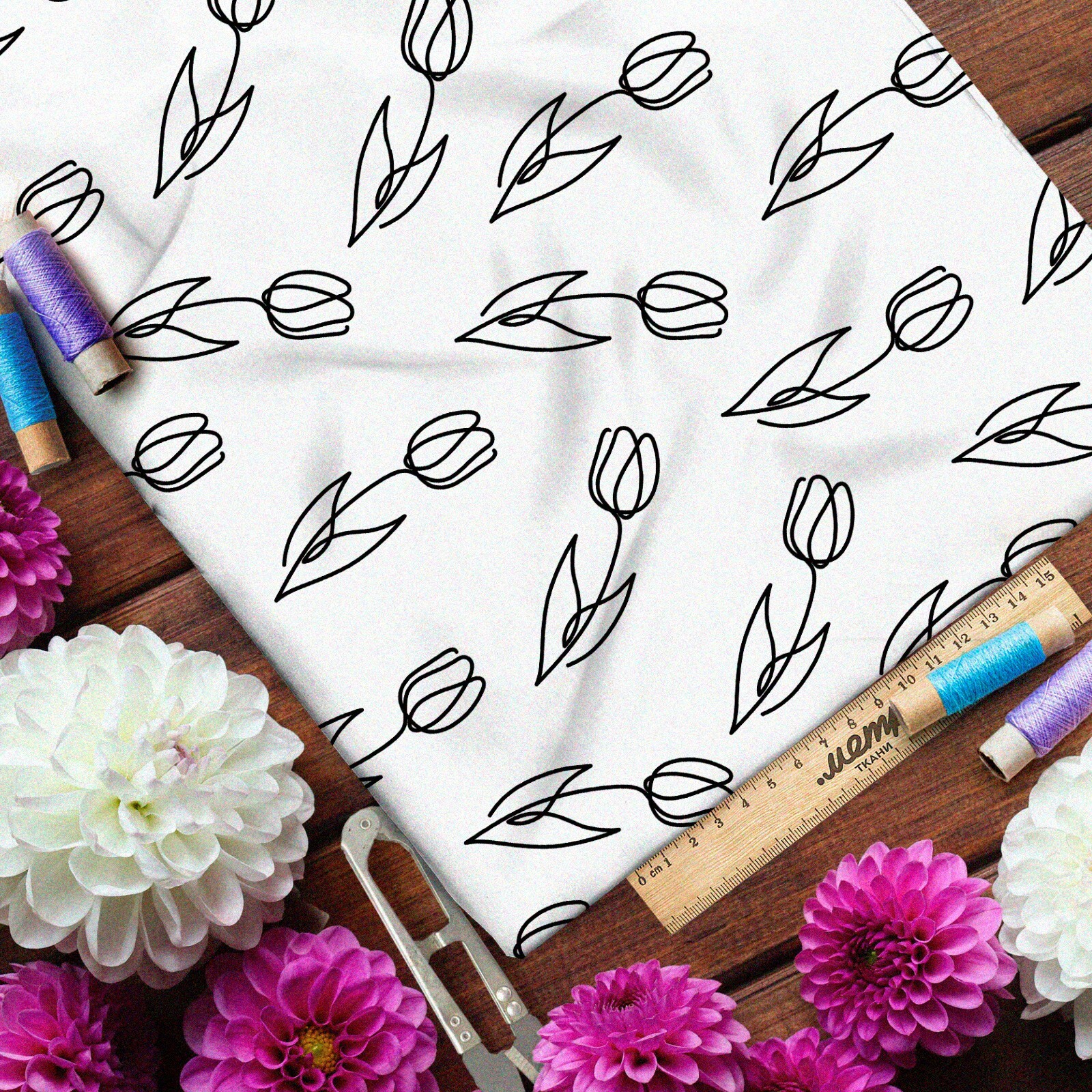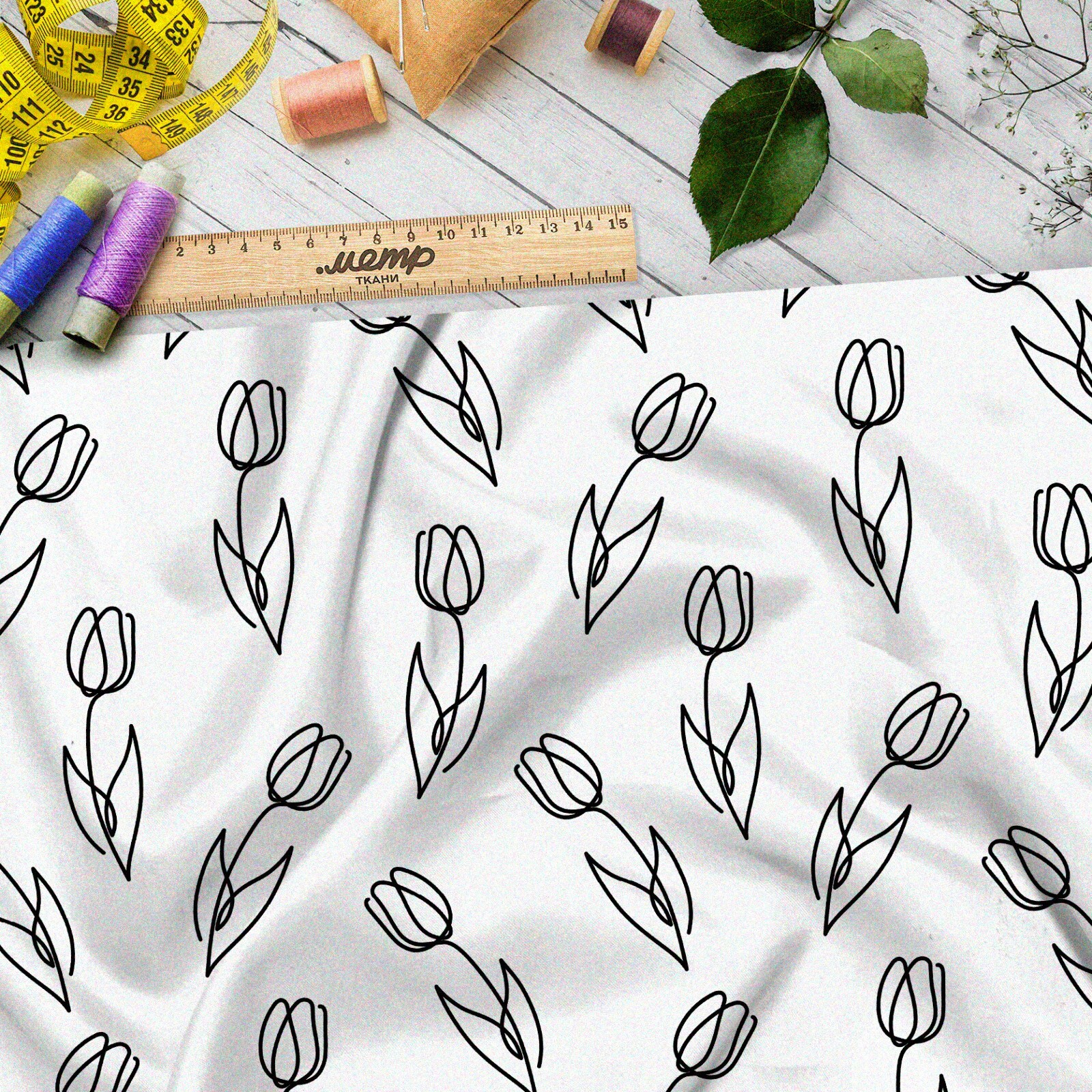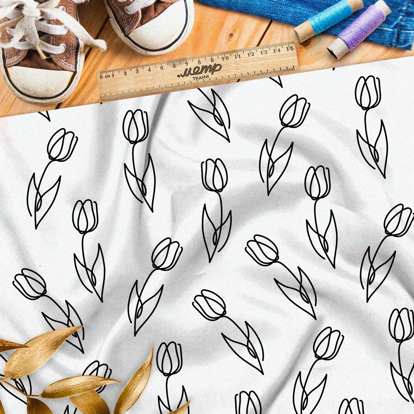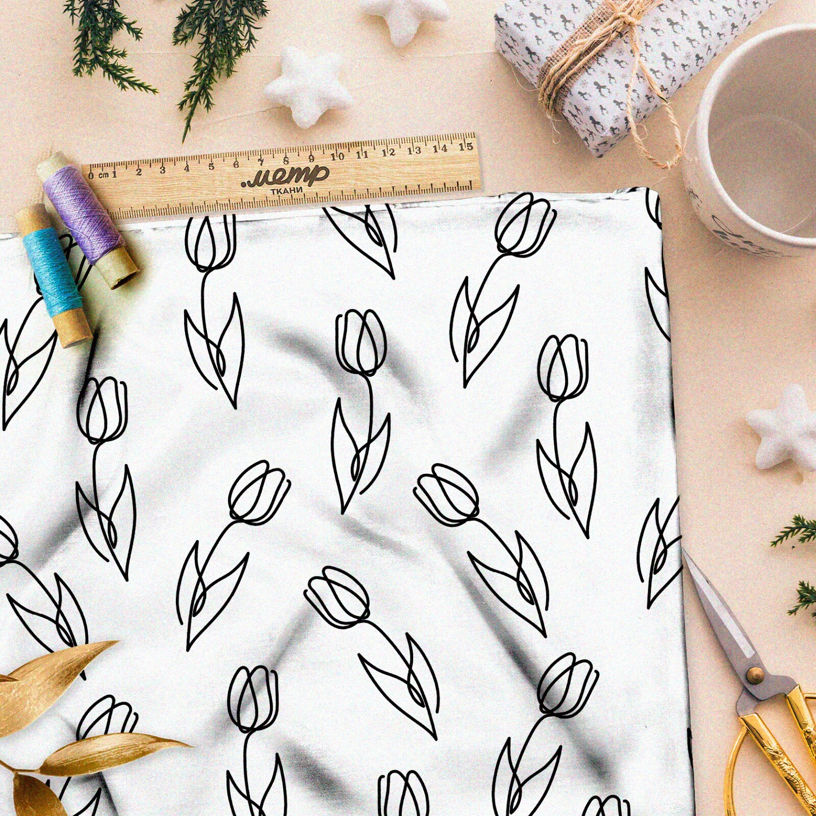 Ткань штапель простые эскизы тюльпанов на бежевом фоне