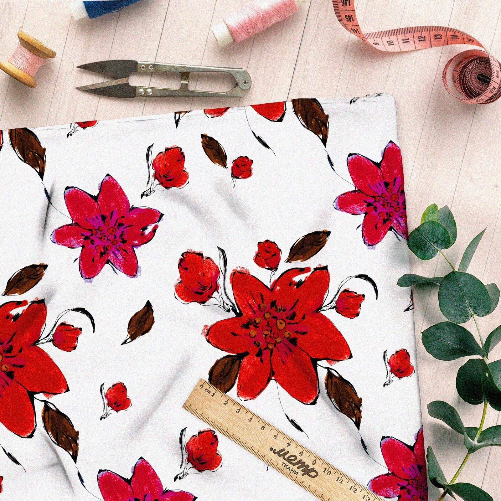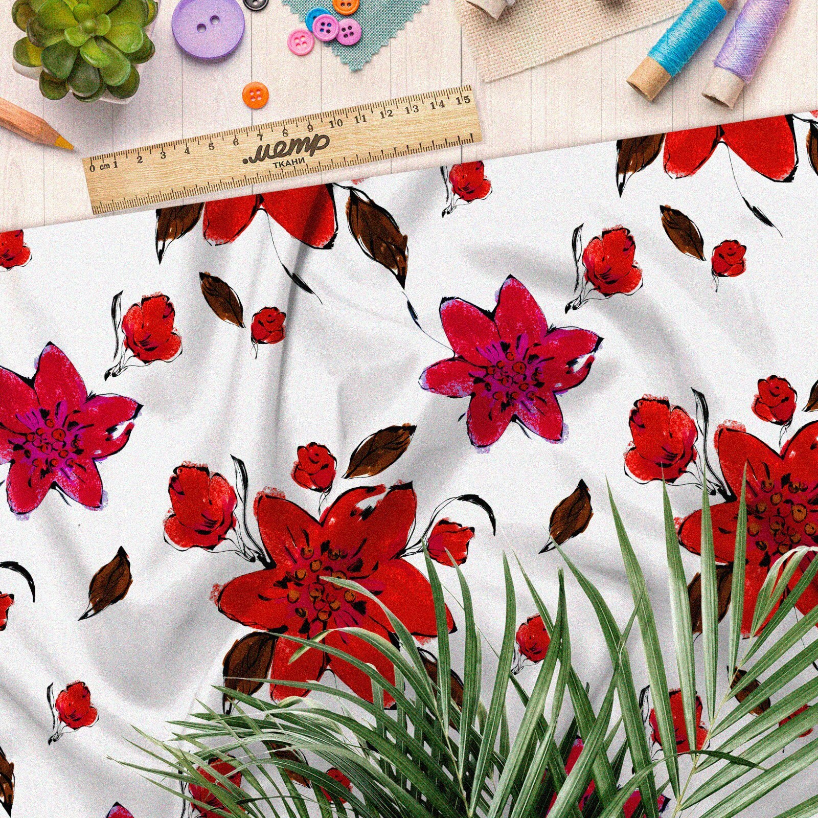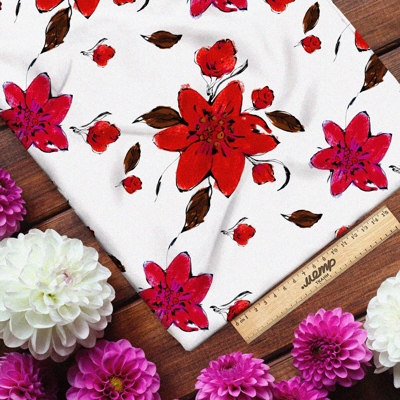 Ткань таффета красные цветочки и листочки